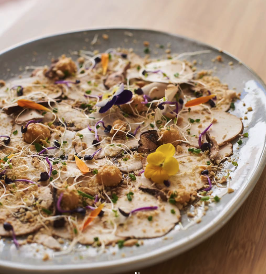 Carpaccio de setas de temporada con hummus y vinagreta de miel y almendras